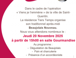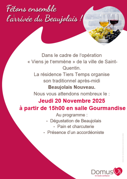 La résidence Tiers Temps vous invite à son traditionnel après-midi "Beaujolais Nouveau" dans le cadre de l'opération "Viens je t'emmène de la ville de Saint-Quentin.