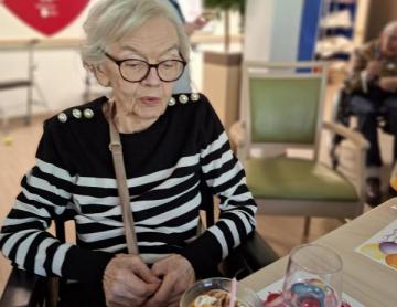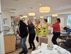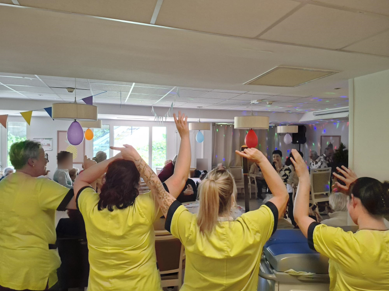 Et la fête ne s’arrête pas là. Lors des anniversaires du mois, alors que chacun profite d’un moment convivial, nos collègues hôtelières passent avec leur chariot de ménage. Mais impossible pour elles de résister à l’appel de la musique ! Elles s’accordent une petite pause, le temps de rejoindre la piste, d’ajouter leur énergie et de partager quelques instants de complicité avec les résidents.