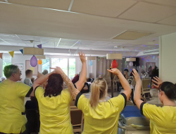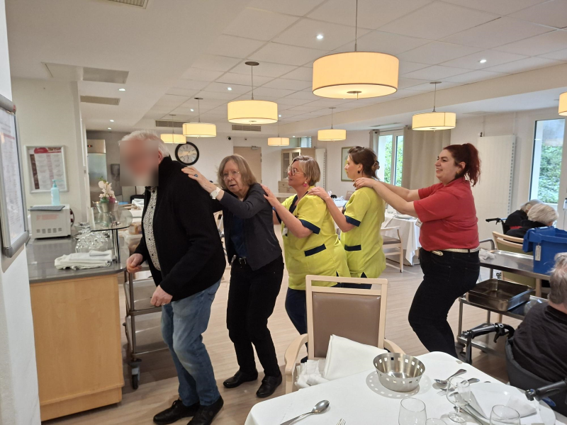 Un simple passage devant la borne musicale… et voilà que résonnent les premières notes de la célèbre chanson de la chenille. En un clin d’œil, résidents et professionnels se laissent entraîner : une farandole se forme, les sourires apparaissent, et la bonne humeur envahit les lieux. Comme quoi, il n’en faut pas plus pour faire décoller l’ambiance !