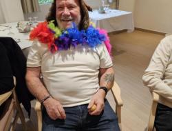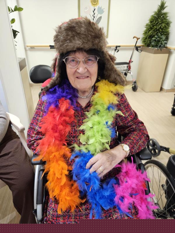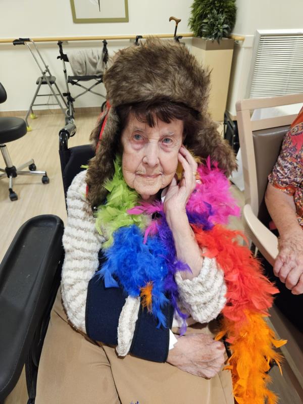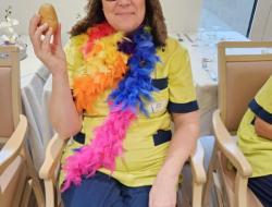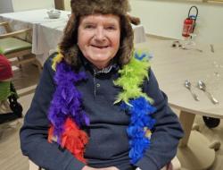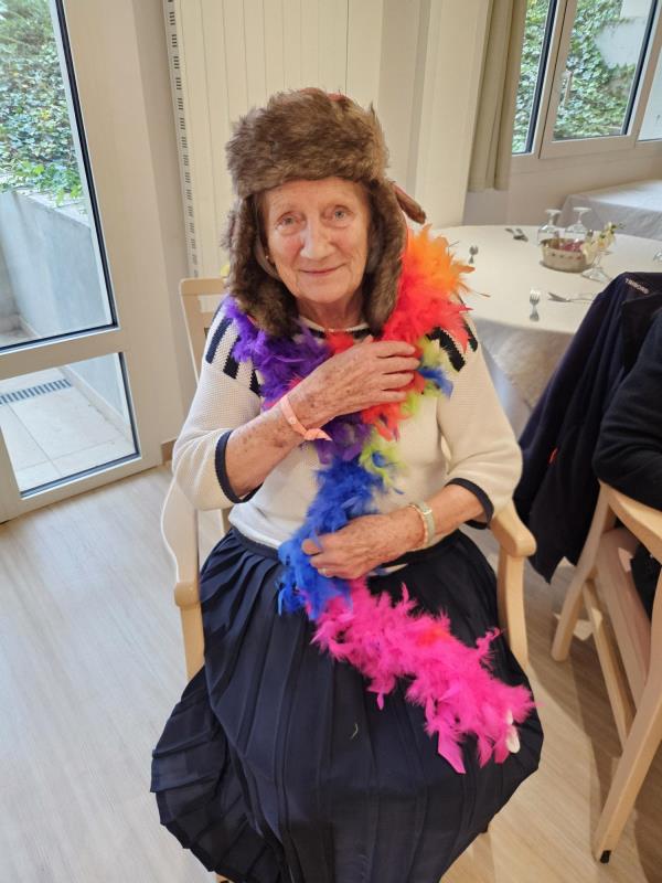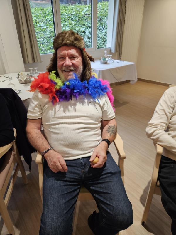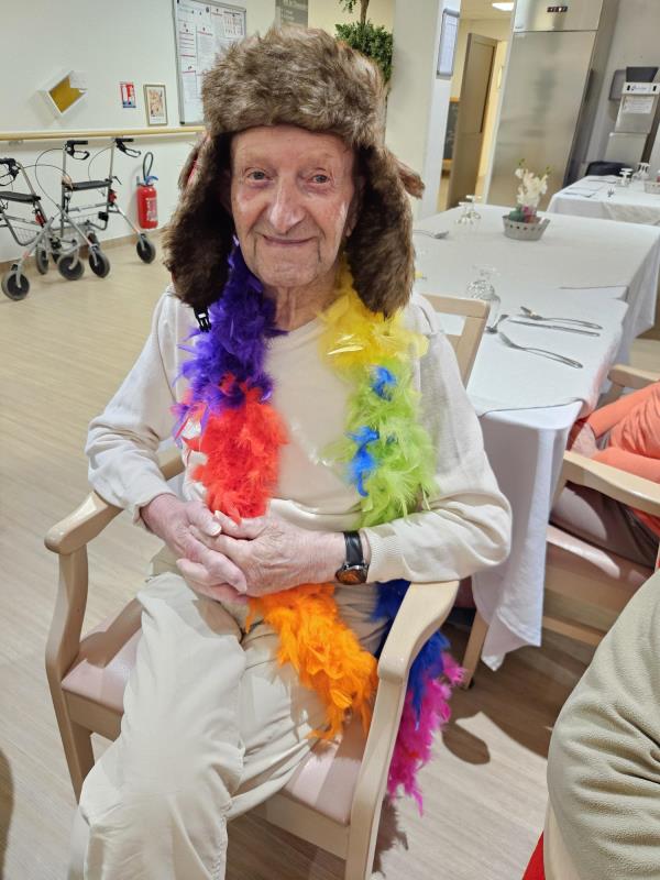 Je mets une musique en route, pendant ce temps les résidents se passe "la patate" lorsque j'arrête la musique le résident qui a la "patate" en main doit répondre à une question. Si le résident donne la mauvaise réponse il était coiffé d'un très beau chapeau avec un splendide boa.