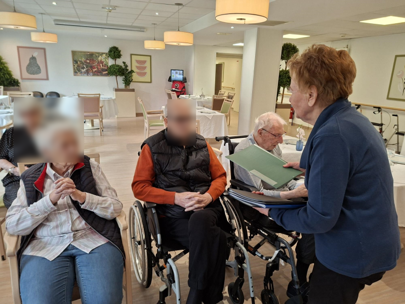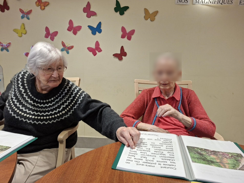 La pair-aidance est une démarche d’entraide entre personnes partageant un même lieu de vie ou des expériences similaires, favorisant le lien social, la solidarité et la valorisation de chacun. Dans le quotidien, elle se manifeste par de petits gestes riches de sens : lors d’activités de lecture, une résidente peut accompagner une autre en lui montrant les mots, facilitant ainsi sa participation et son plaisir. De même, pendant la chorale, une résidente peut distribuer les paroles des chansons aux personnes ayant des difficultés à se déplacer, apportant une aide précieuse à la fois aux autres résidents et à l’animatrice.