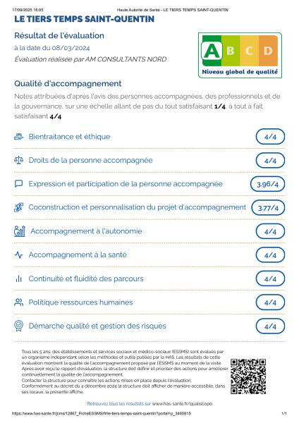 Résultat : Niveau « A » - Démarche Qualité Avancée, soit la meilleure note possible ! Ce résultat vient saluer le professionnalisme et l’engagement quotidien de nos équipes, et confirme la qualité du travail accompli au service des résidents. Nous remercions chaleureusement tous les collaborateurs, les résidents et leurs proches pour leur contribution à cette réussite. Et parce que l’amélioration continue est au cœur de notre démarche, nous restons à l’écoute de chacun pour faire encore mieux demain.