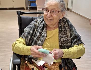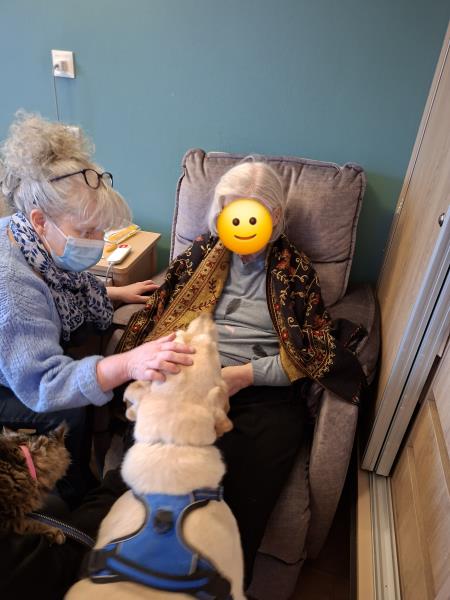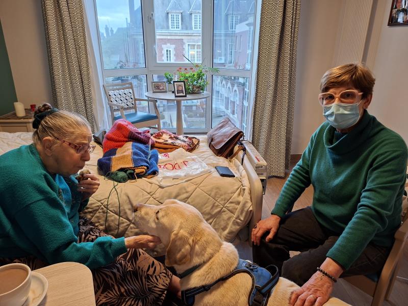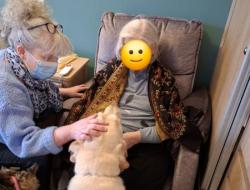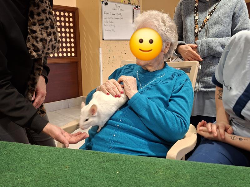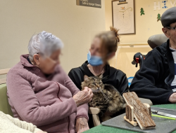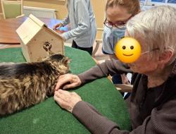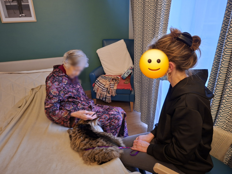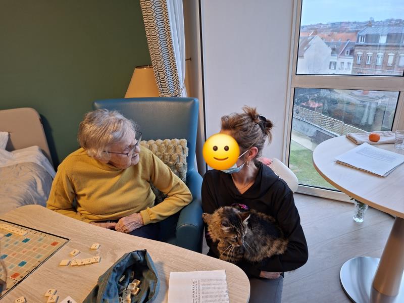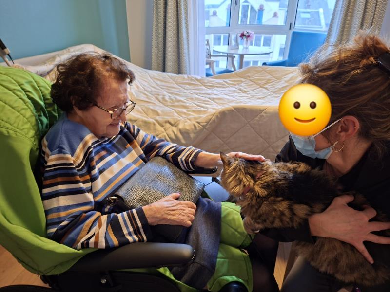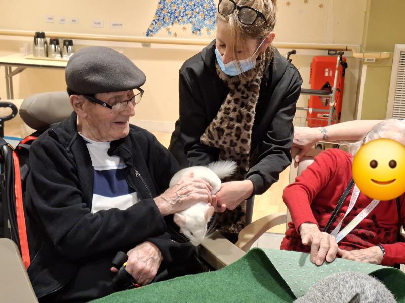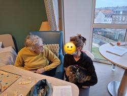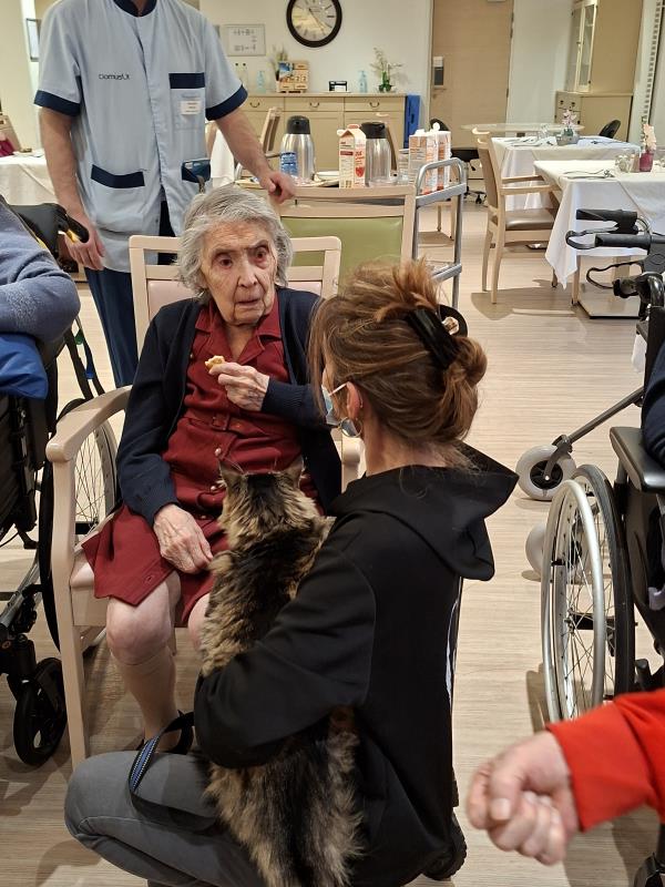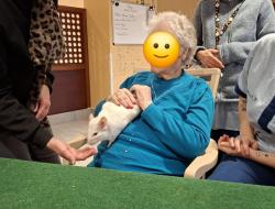 Dans un second temps, Lydie s’est rendue au deuxième étage pour passer une heure auprès des résidents en chambre, permettant à chacun de vivre ce moment privilégié au plus près des animaux, dans une ambiance apaisante et conviviale.